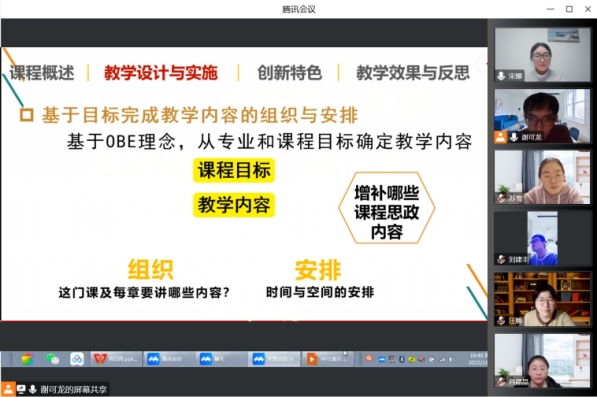 为明确思政课程改革方向与建设方法,推进课程思政建设进程,提高数学教师立德树人水平,12月8日,数学教研室利用腾讯会议,召开了以“课程思政建设”为主题的教研活动。本次会议由数学教研室主任程秀丽主持,数学教研室全体教师参加。
