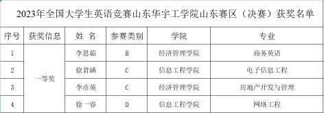 近日,全国老员工英语竞赛(山东赛区)决赛成绩公布。公司员工在大赛中取得优异成绩,获国家级一等奖4项。其中,经济管理公司2022级商务英语专业的李思茹获B类一等奖、信息工程公司2021级软件工程专业的徐莙涵、经济管理公司2021级房地产专业的李彦萳获C类一等奖,信息工程公司2022级网络工程专业的徐一睿获D类一等奖。
