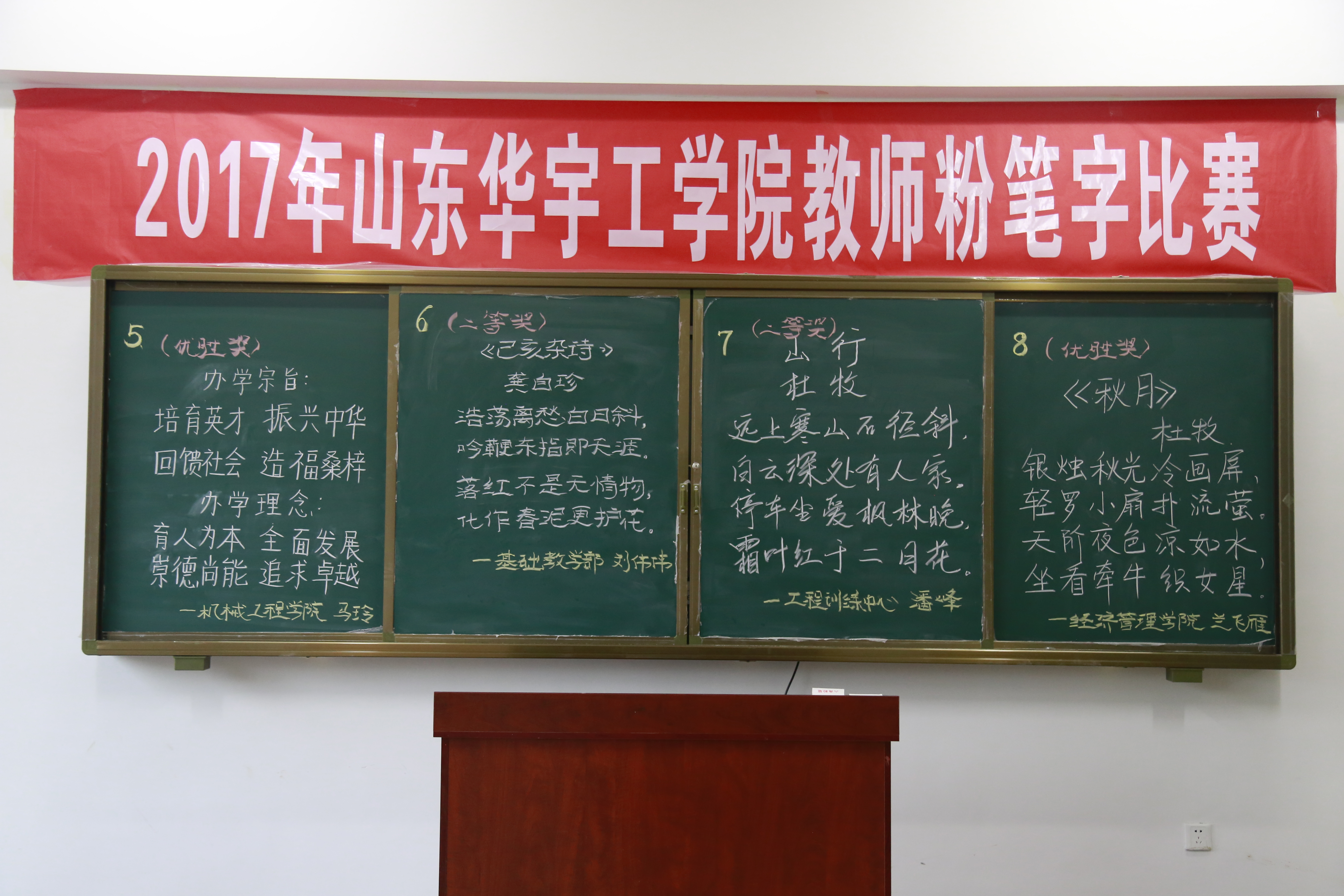 整场比赛场面紧张、有序,氛围浓厚。选手抽签决定了参赛号和书写内容,进入对应的教室,在规定的10分钟内完成规定内容。比赛现场,教师们凝神运气,书写个性鲜明,有飘逸舒展的行书,有遒劲有力楷体,有形神俱佳的隶书,无不展现着华宇教师的风采。于维同、张艳丽、李虎君等专家评委,遵循公平、公正的原则,按照《粉笔字比赛评分细则》,进行独立评分。共评出一等奖2名(设计与艺术公司李清、基础教学部魏再冉);二等奖4名(设计与艺术公司吕倩、电气工程公司魏夕合、工程训练中心潘峰、基础教学部刘伟伟);三等奖6名(思政部孙肖霞、工程训练中心刘莹、电子信息工程公司肖媛媛、建筑工程公司张旭、电子信息工程公司曹金静、思政部黄玉艳)。最后,专家评委对本次粉笔字比赛进行了精彩点评,对教师的基本功训练提出了要求。
