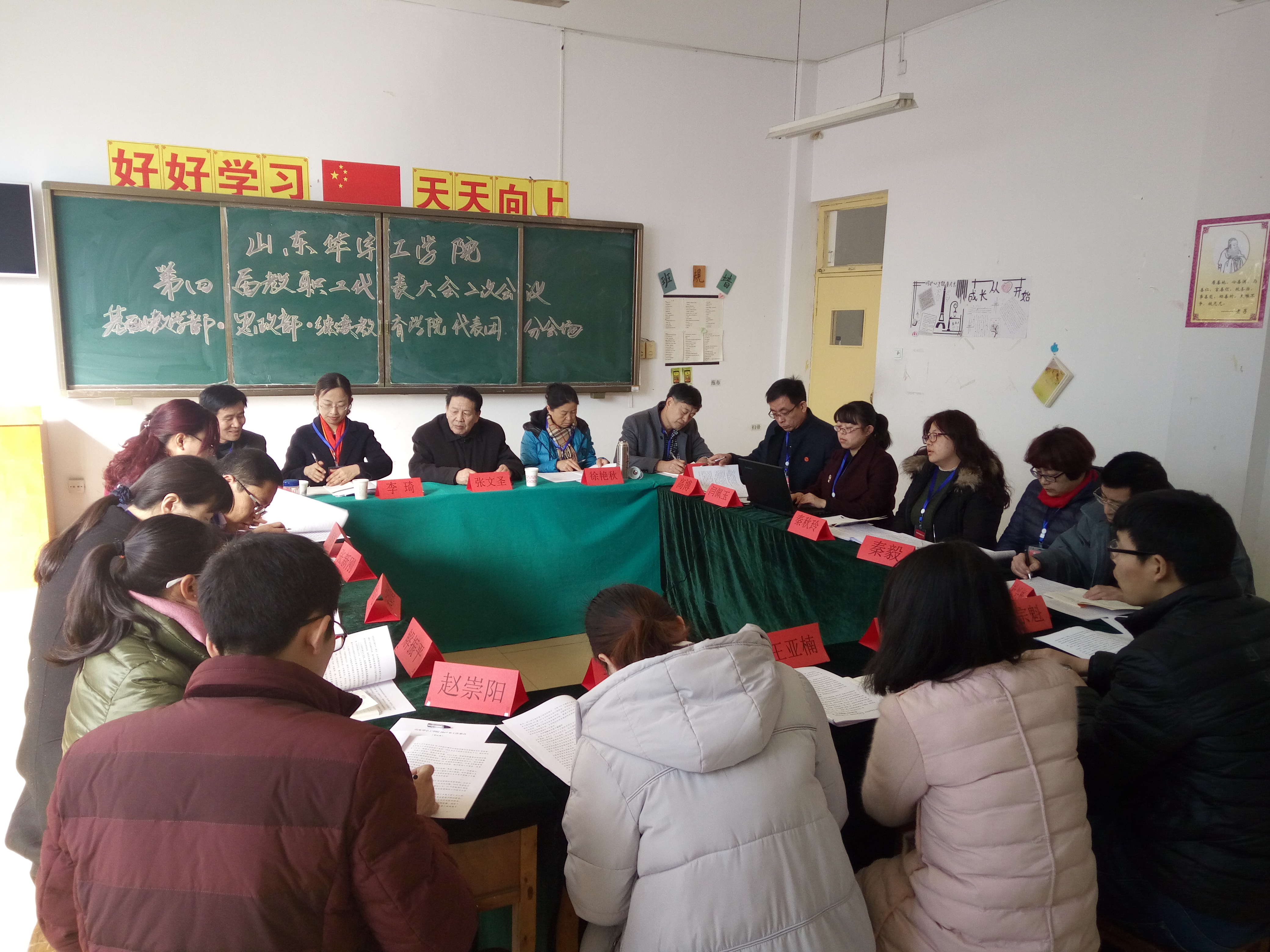 2017年2月25日,继太阳成集团tyc9728第四届教职工代表大会开幕式之后,基础部工会分会在3号楼101顺利召开。此次分会由张文圣经理莅临指导、基础部工会全体教师代表参加了会议。大会主要议题是结合本职工作对梁董事长的工作报告谈谈自己的体会,会议由基础部工会主席李琦主持。