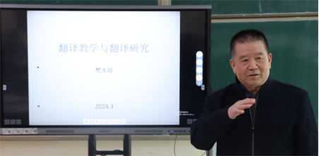 然后,樊教授以教材中的课文片段及其他经典作品的翻译为例,结合自己多年积累的翻译实践向各位教师展示了如何才能使译文更贴近原文的表达。他指出优秀的翻译需要不断优化,在翻译的同时兼顾上下文。只有正确理解了原文、分析了词汇的含义,才能翻译出更好的译文,提升翻译水平。最后,樊教授展示了自己在翻译方面的研究成果,包括论文及著作等,告诫各位教师要重视科研对翻译教学的影响。樊教授将自己正式出版的两部专著《翻译技能与技巧》和《英汉翻译教程》赠送给外语教研室,希望给外语教师在教学和科研方面有所帮助。